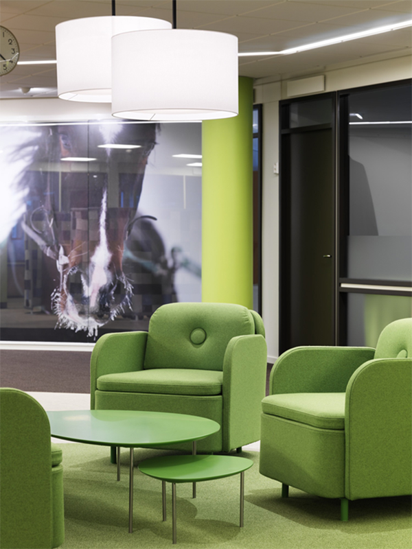 瑞典是世界上排名第三的马术大国,仅次于美国与法国。在这一领域的佼佼者SVENSK Travsport公司成立于1952年,如今他们重新诠释自己的品牌,办公室也重新改造以更好的表达公司文化。色彩丰富的办公空间给员工营造了轻松的工作氛围。设计师给热衷这项运动的人们带来个性的空间:圆形书柜犹如树干围合成一个很私密的独立空间,彩色书籍形成靓丽的色带环绕着书柜,令人联想到赛马的“跑道”。逼真的赛马写真犹如置身赛马场令人热血沸腾,办公室的各种细节设计把企业文化表现的淋漓尽致。